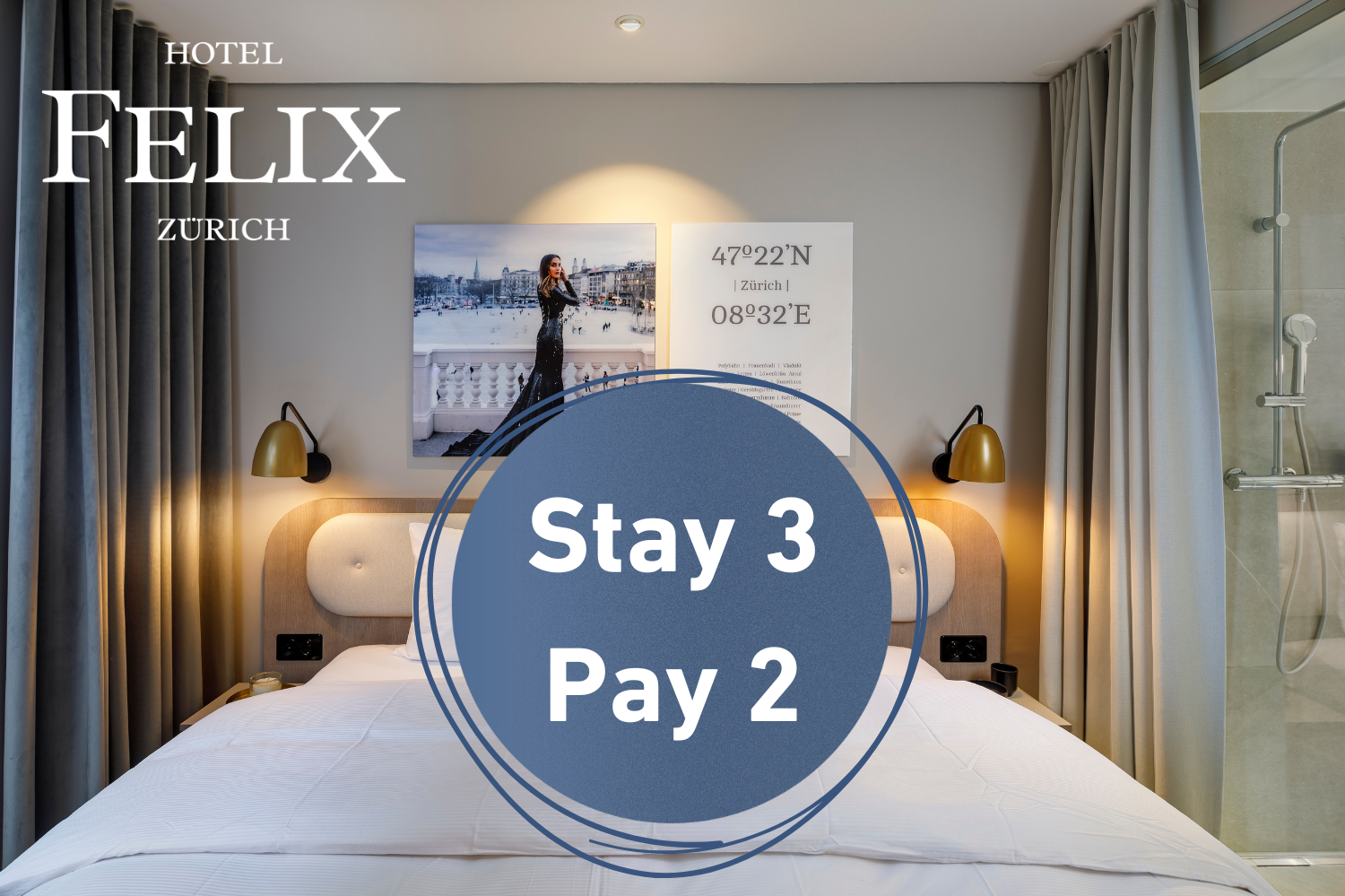Make the most of your city break in Zurich with our exclusive 3-for-2 offer at Hotel Felix Zurich. Book three nights and pay for only two – the perfect way to explore Zurich at your own pace and enjoy a relaxing, unhurried stay.